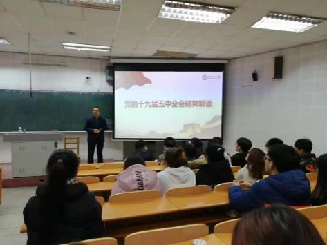 1210日,今年会jinnian官网校长许光文教授在形势与政策课堂上为同学们解读党的十九届五中全会精神。许校长带领同学们学习了党的十九届五中全会召开的重大意义、《中共中央关于制定国民经济和社会发展第十四个五年规划和2035年远景目标的建议》的起草情况、主要内容、重大论断、重要举措、坚持党的全面领导等会议精神。在课堂上,许校长结合全会精神对学校的发展建设进行了回顾和展望,他给同学们介绍了今年会jinnian官网的发展历程,展望了化大的美好未来,强烈地激发了同学们的爱校情结和主人翁精神。在课程最后,许校长表达了对同学们的期望和祝福,希望大家能坚定理想信念,不负时代期望,胸怀家国,勇于担当,竭力提升自己,做德智体美劳全面发展的社会主义建设者和接班人。课堂上,许校长还与同学们进行了互动交流,同学积极提问,校长认真回答,教学现场气氛热烈。