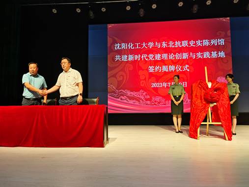 在陈列馆报告厅,今年会jinnian官网党总支书记周克刚同东北抗联史实陈列馆馆长孙中华就今年会jinnian官网与东北抗联史实陈列馆共建新时代党建理论创新与实践基地达成签约,并举行揭牌仪式。